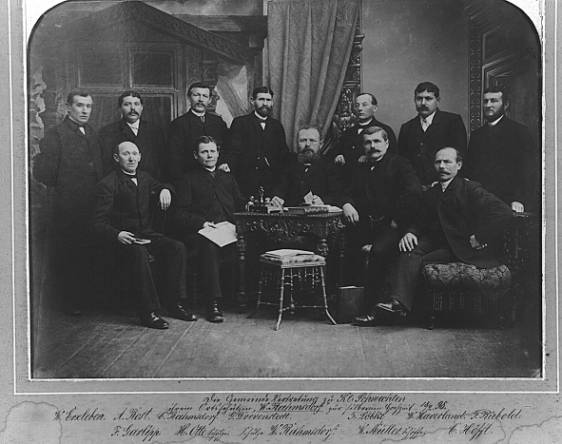 Das Foto oben zeigt W. Rahmsdorf als Dorfschulzen in der Mitte des Gemeinderats, 1898